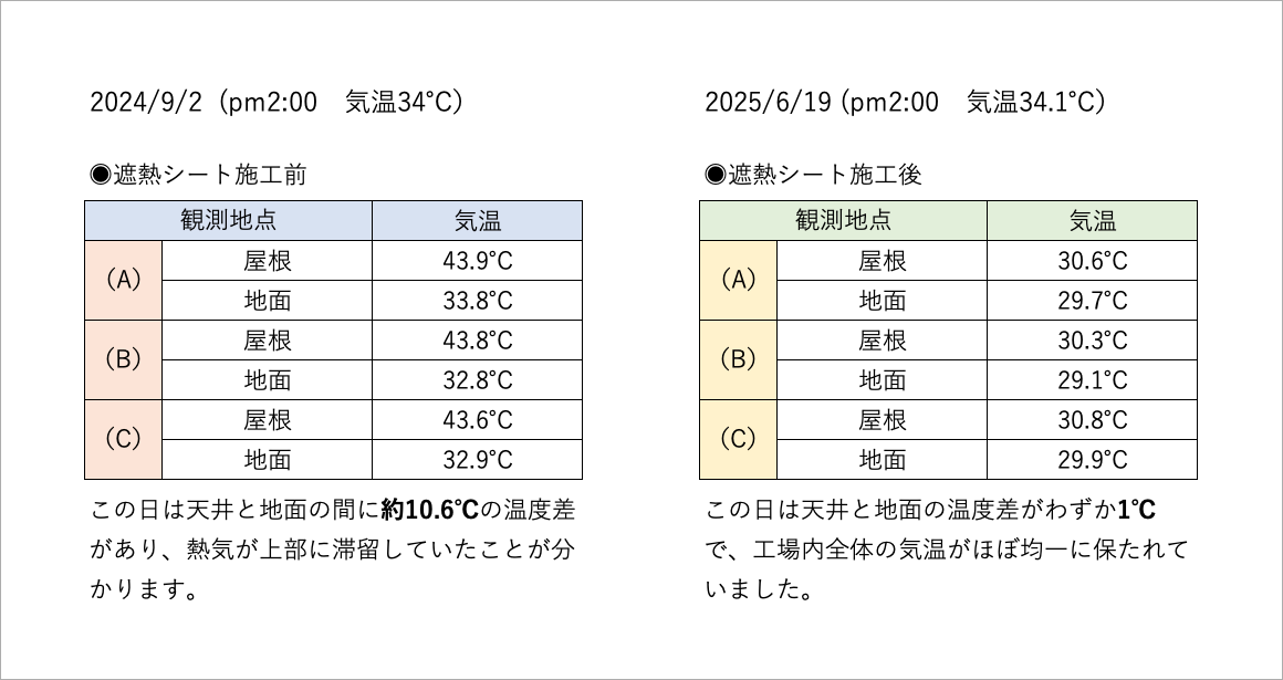 その結果、遮熱シート施工前の2024年は中間高さで 約36〜37℃、施工後の2025年は中間高さで 約30℃ となり、約6〜7℃の低下が確認されました。これは、作業環境の改善において大きな効果を示すものといえます。