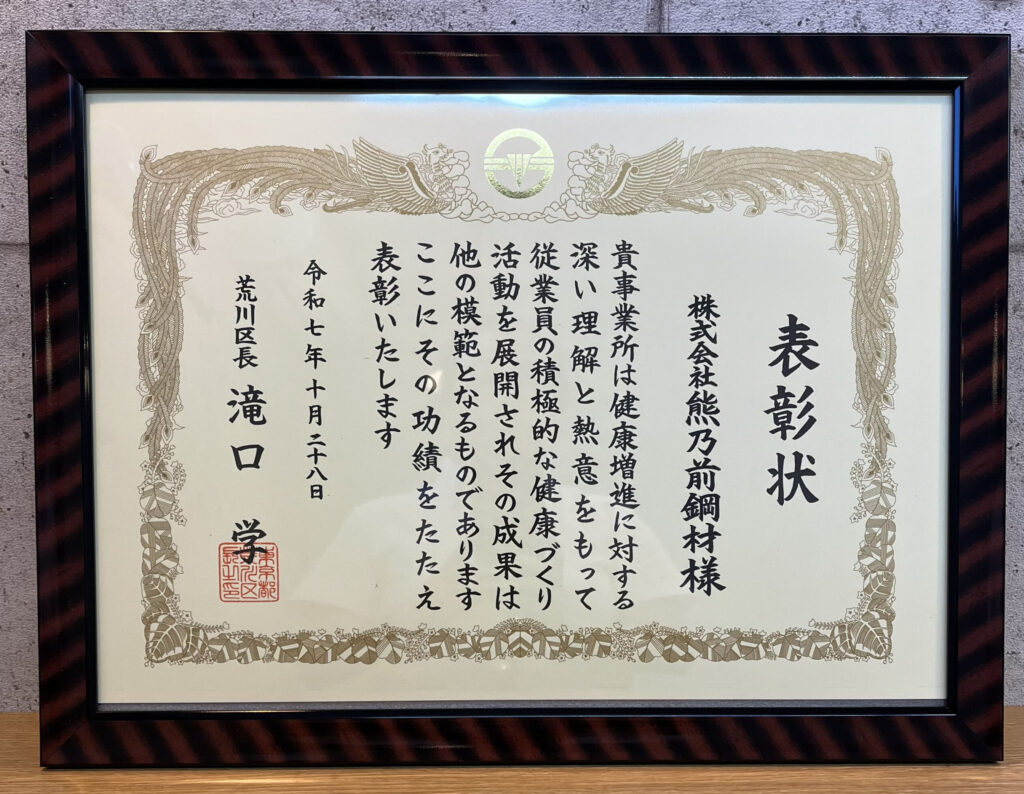 このたび、株式会社熊乃前鋼材は「荒川区健康づくり推進事業所」として表彰されました!🎉